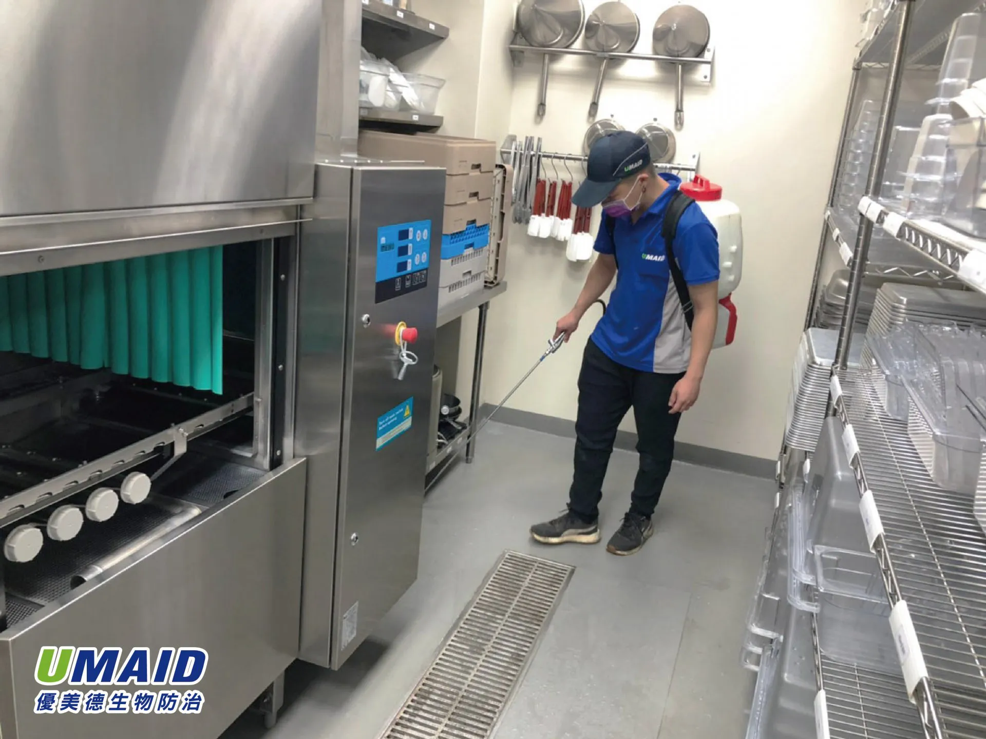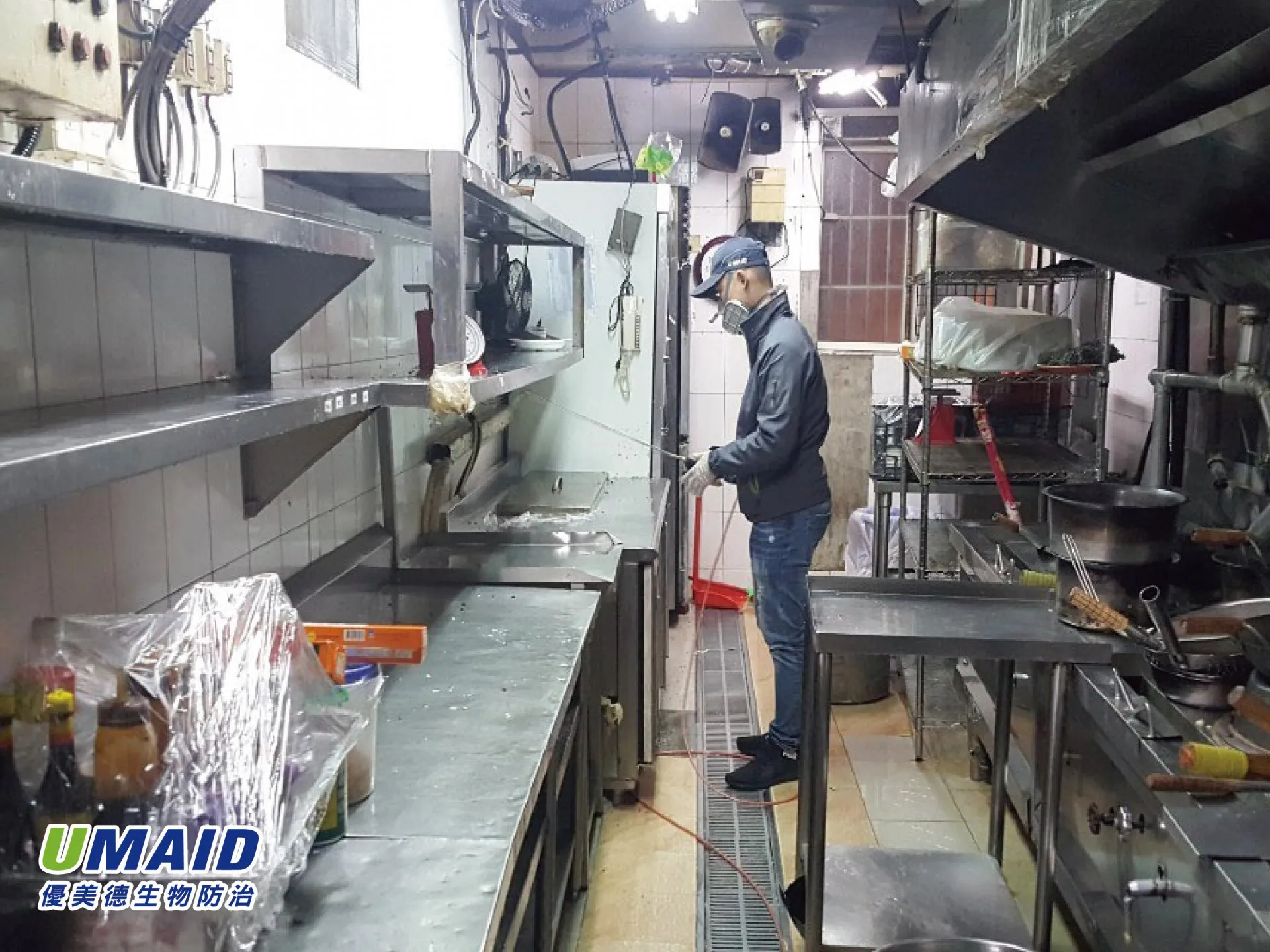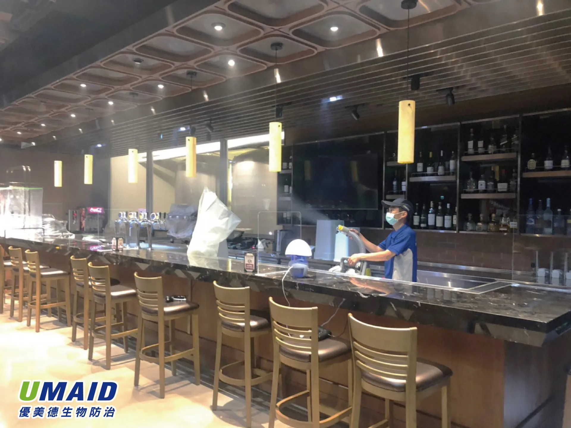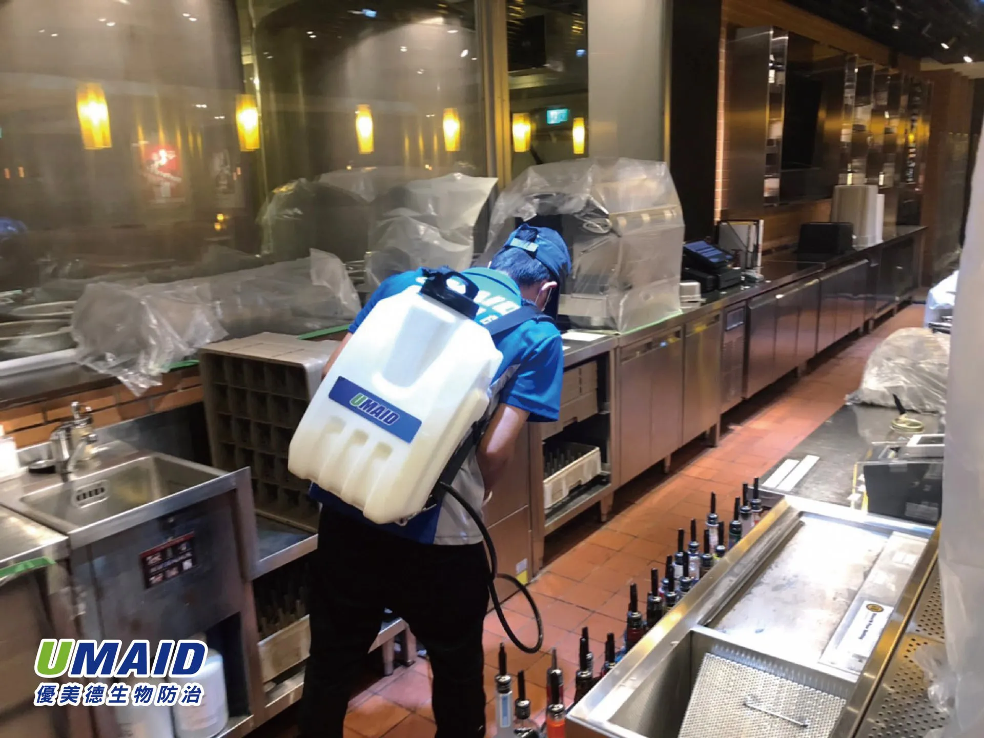 依餐廳環境需求,使用空間噴灑方式防治害蟲。
